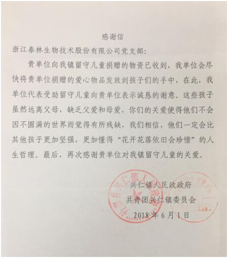 7月初,黨支部收到了興仁鎮兒童寄來(lái)的感謝信,信中表達了對泰林生物黨支部為他們帶去關(guān)懷與祝福的誠摯感謝。