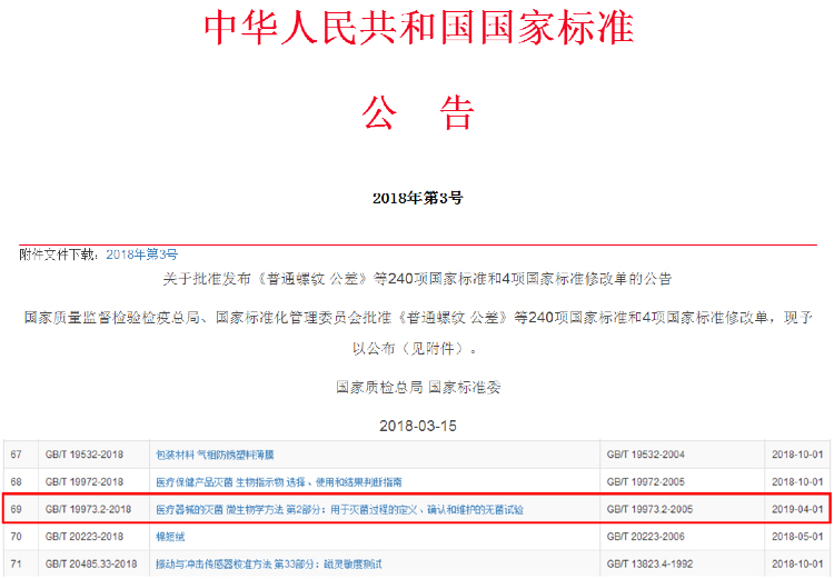 3月15日,國家質(zhì)量監督檢驗檢疫總局、國家標準化管理委員會(huì )發(fā)布2018年第3號中國國家標準公告,對新一批國家標準予以公布,其中包括了由泰林生物為第一起草單位的國家標準《醫療器械的滅菌 微生物學(xué)方法 第2部分:用于滅菌過(guò)程的定義、確認和維護的無(wú)菌試驗》。