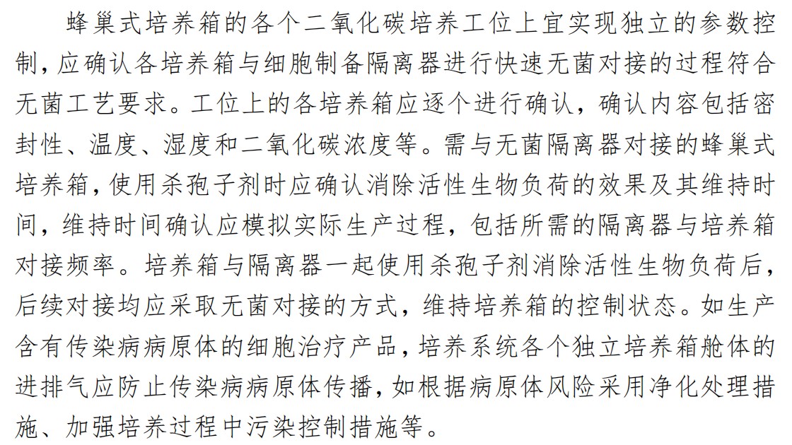 蜂巢培養箱是由蜂巢式多工位模塊和配套的培養箱組成,為細胞培養的常用設備,在《指南》中也有較詳細的闡述,主要包括設備構成與內部環(huán)境要求、設備電源要求、氣源要求、參數和性能的確認等。